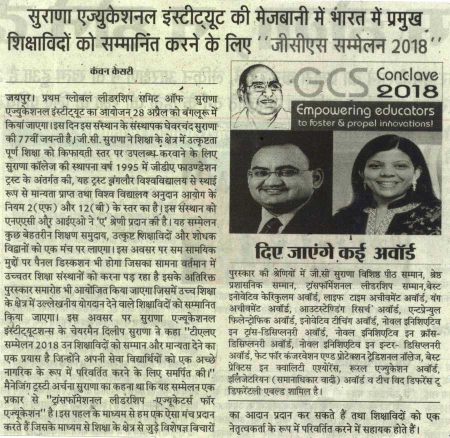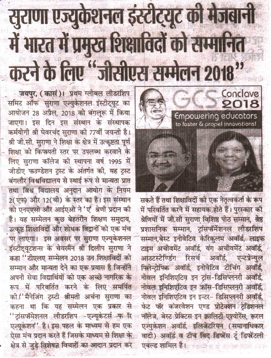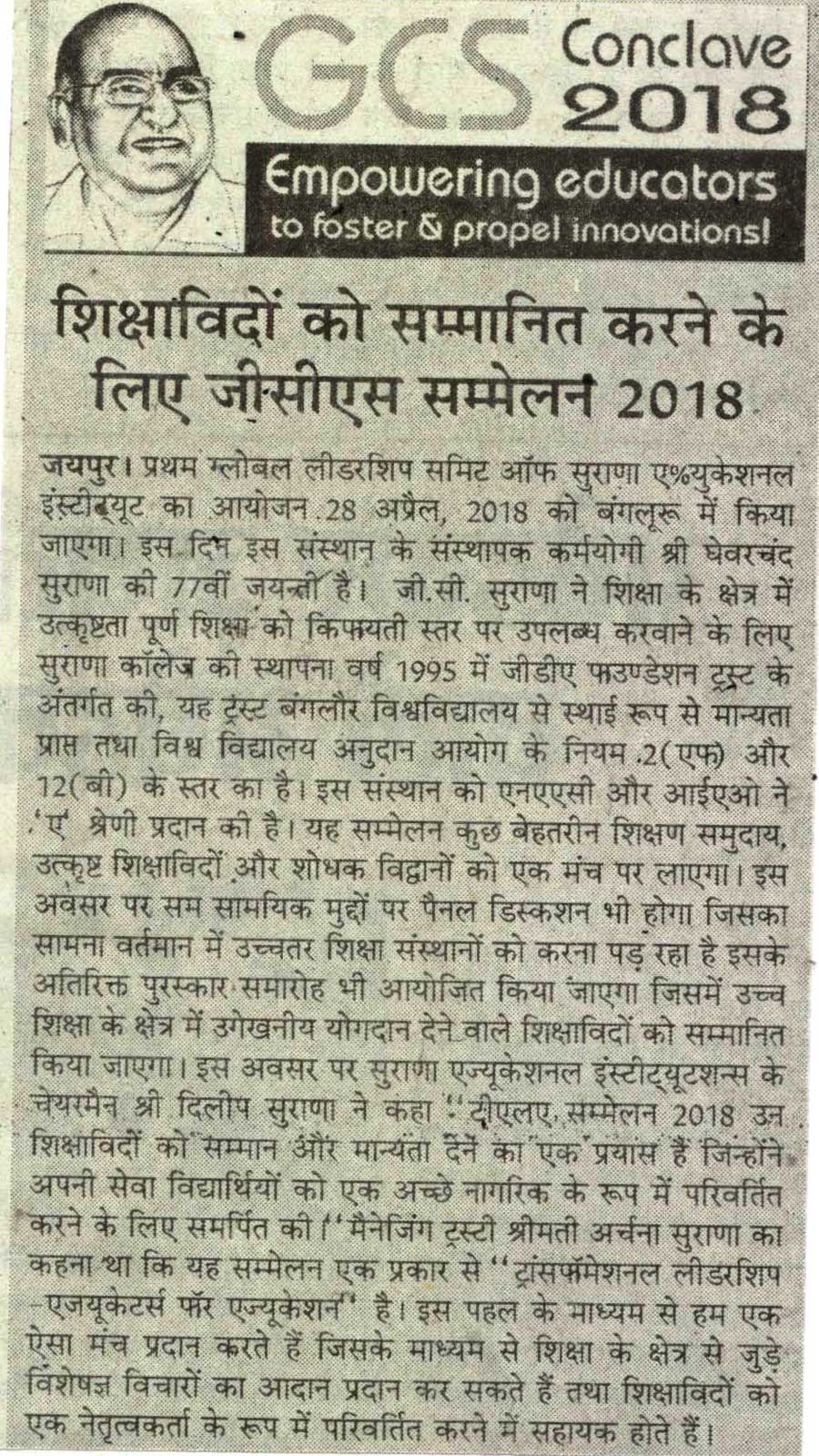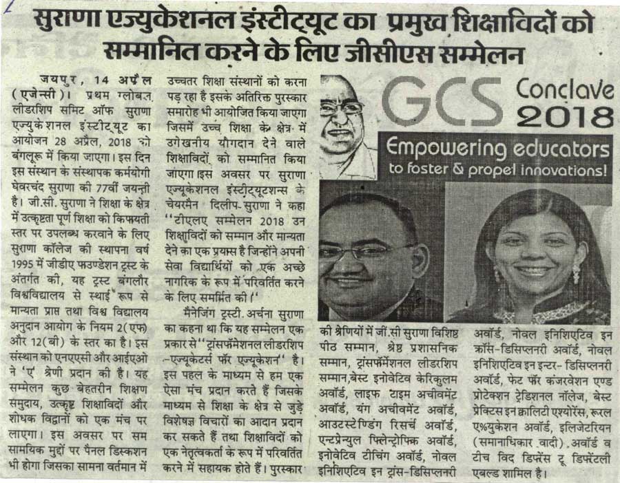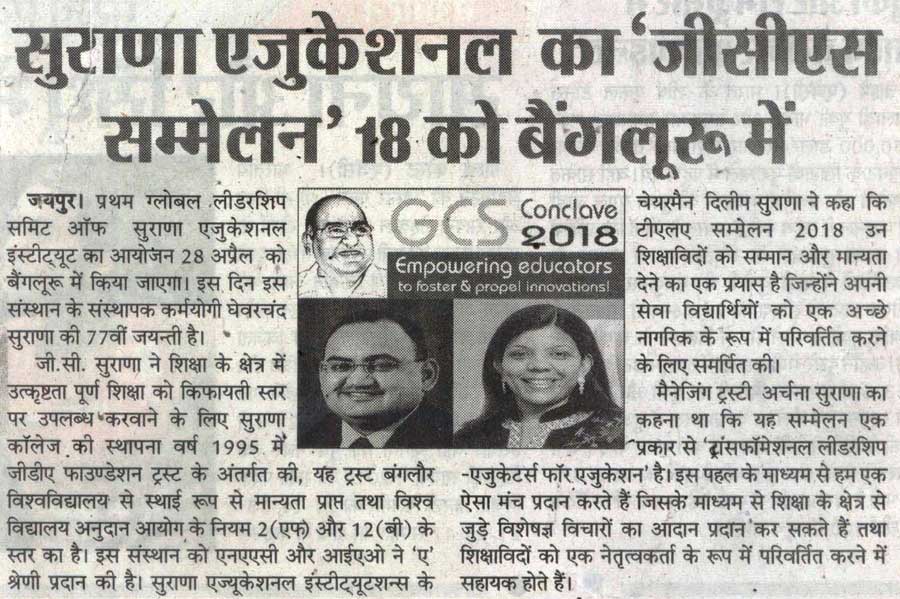 1st Annual GCS Conclave 2018 Of Surana Educational Institutions To Recognize Shining Stars Of Indian Education Sector, To Debate "Empowering Innovations In Transformational Leadership" – EDUCATORS FOR EDUCATION" In Bengaluru On 28th April 2018